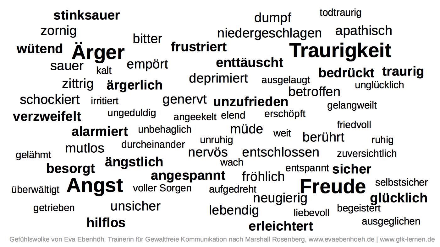 In dieser Gefühlswolke findest du Gefühlsbegriffe grob nach den vier Grundgefühlen Ärger, Trauer, Angst und Freude sortiert.